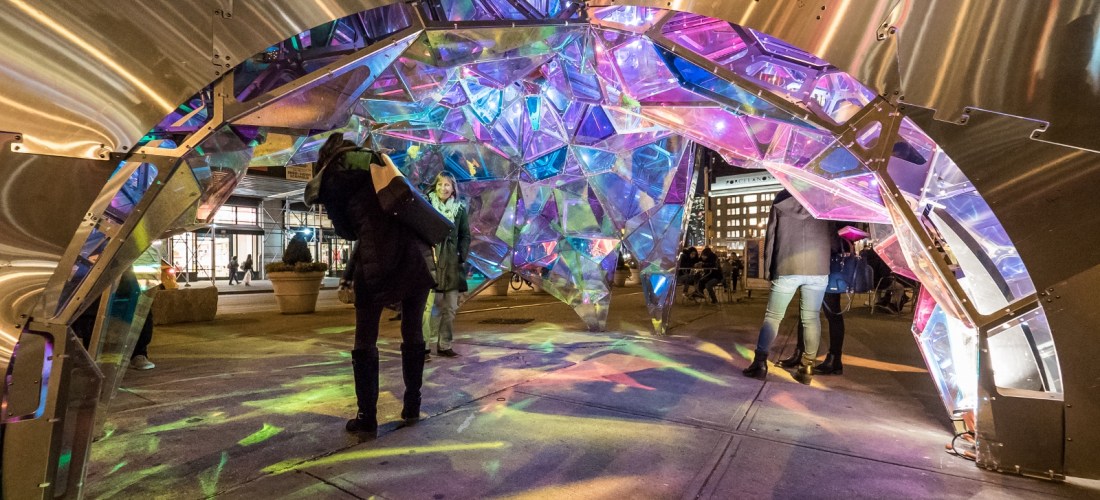 PostsThere’s a recently installed art piece in the North Flatiron Public Plaza called Nova by SOFTlab. It looks a bit like a kaleidoscope with jewel cut patterned plastic tiles and various colored lights coming through. I didn’t notice it when I was up close to the piece, but I saw in my photos later that the exterior has a brushed finish that reflects light in different patterns.