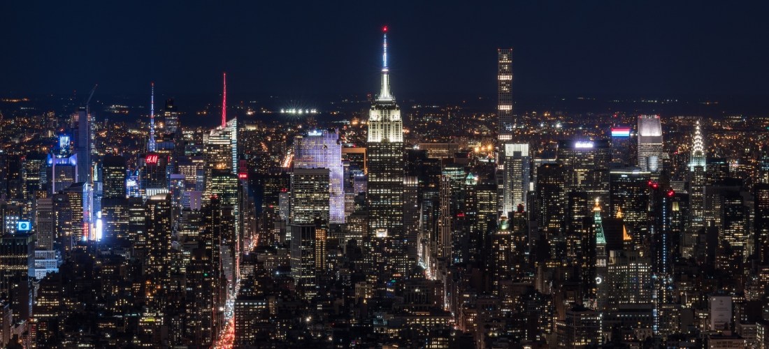 The image above shows a high angle night view of Midtown Manhattan as seen from Lower Manhattan.